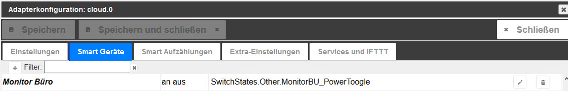 Wenn Du nun in der Alexa App Deine Smarthome Geräte aktualisierst (bzw. nach neuen suchst), kannst Du bereits laut diesem Beispiel mit "Alexa. Schalte Monitor im Büro ein" bzw. Alexa, Schalte Monitor im Büro aus" eben dieses Objekt "javascript.0.SwitchStates.Other.MonitorBU_PowerToogle" zwischen "true" und "false" hin und herschalten.