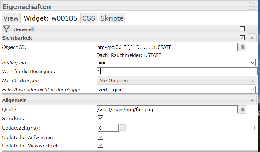 Verwendet habe ich ein basic Image widget, was nur dann angezeigt werden soll, wenn "State" des Rauchmelders eine 1 liefert.