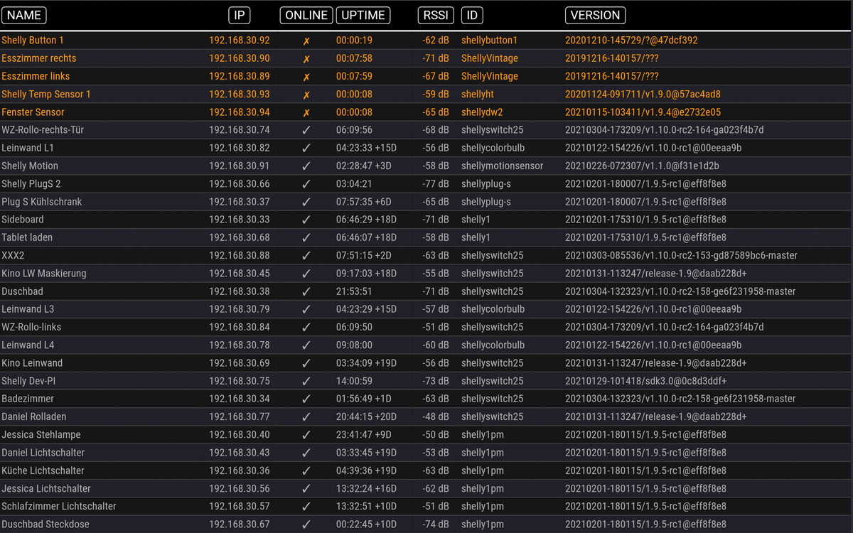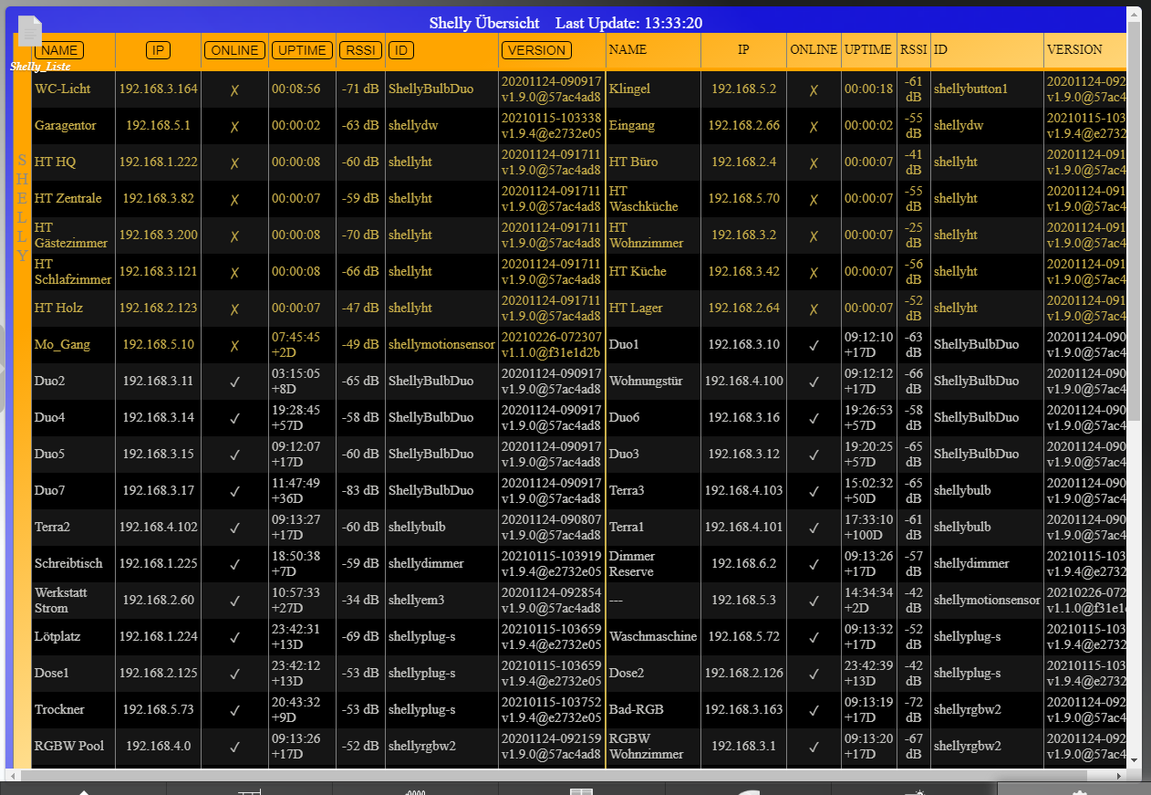 Überschrift ganz rechts bei (Version): könntest du die Shelly zählen und anzeigen, da würde mir gefallen (32/8)- soll heissen 32 online und 8 offline. Schriftfarbe wie die online und Offline konfigurierte Farbe?