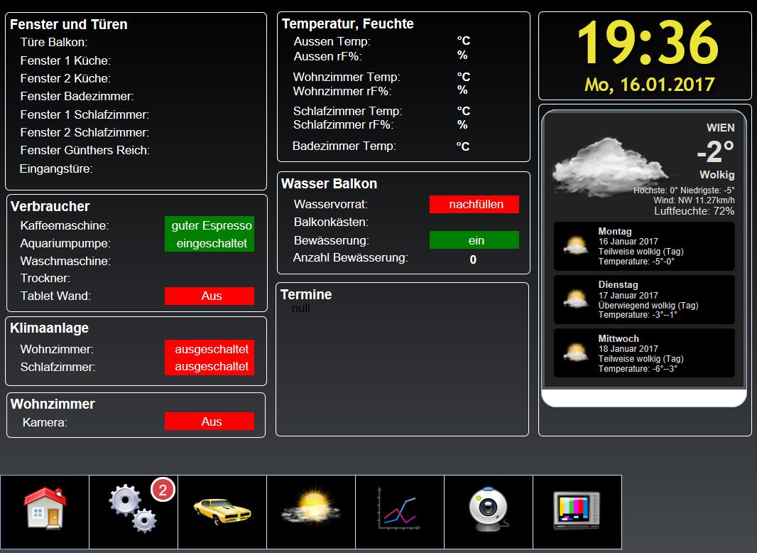 Nun habe ich folgendes Problem damit. Beim Erstaufruf oder manuellen aktualisieren werden dutzende Stati nicht angezeigt. Im Screenshot meines Einstiegs Views sieht man deutlich da fehlt was. Alle Fensterzustände die so wie z.B. guter Espresso angezeigt werden fehlen. Auch die Temperaturwerte sind nicht da. Erst wenn die Werte aktualisiert werden (Fenster auf oder Übertragung der Temperaturwerte) ist die Anzeige vorhanden. Nach dem Neuaufruf des Browsers fehlt wieder das meiste.