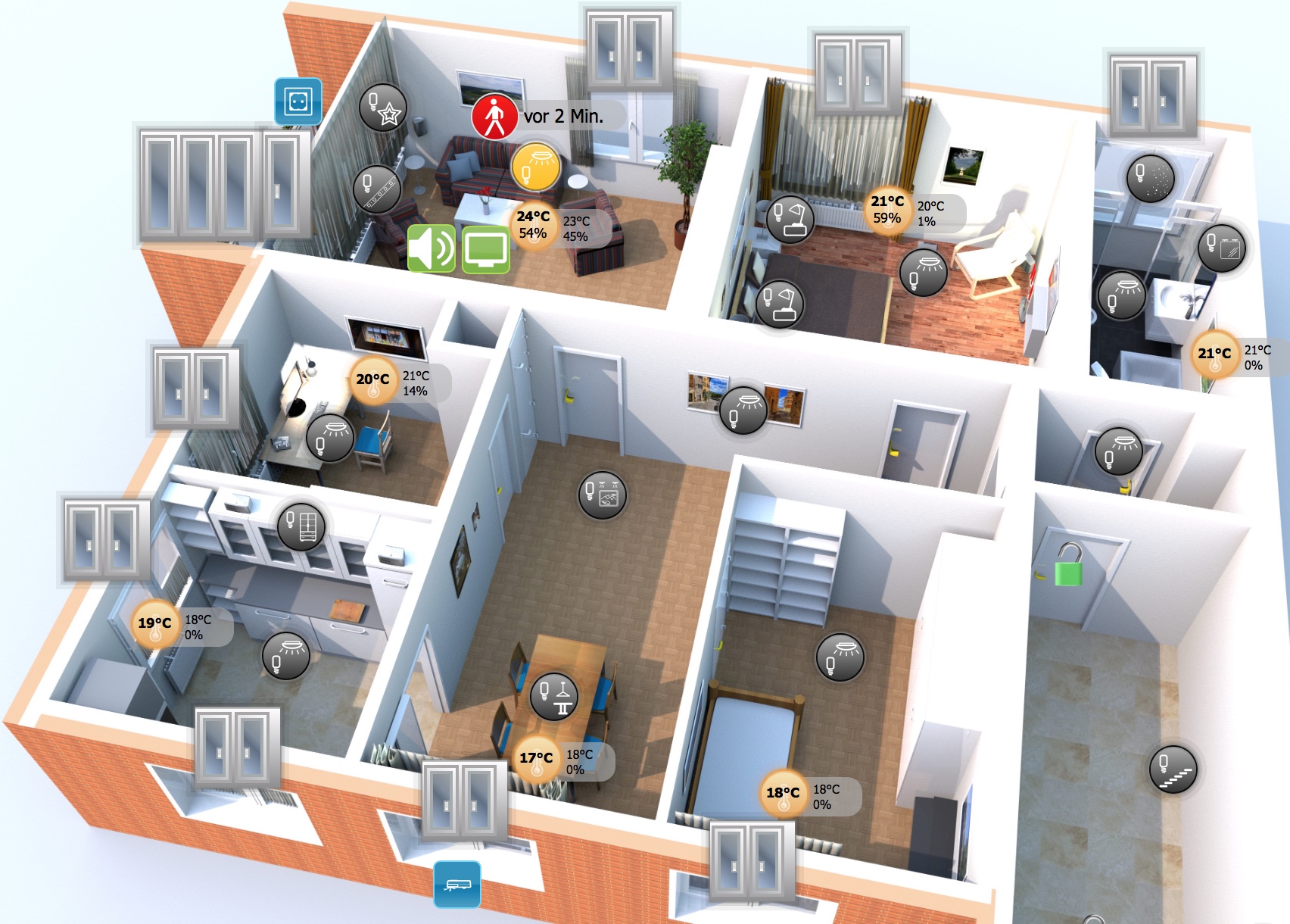 Du wirst n Antworten bekommen, 50% werden dir gefallen und 50% nicht. Meine eher nicht, da ich kein Fan von Grundrisszeichnungen und Grafiken für die Bedienung bin. Nach meiner Erfahrung wirkt dieses zu "technisch", gerade für die BenutzerInnen, die es später nutzen sollen. Ich finde es besser die Technik zu verstecken und stattdessen eine Form zu wählen, die bekannt ist: Apps, mit Registerseiten und Menüs.Am sichersten ist es aber, wenn du deine Frau und deine Kinder fragst