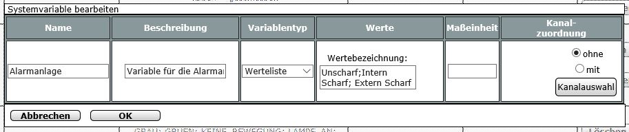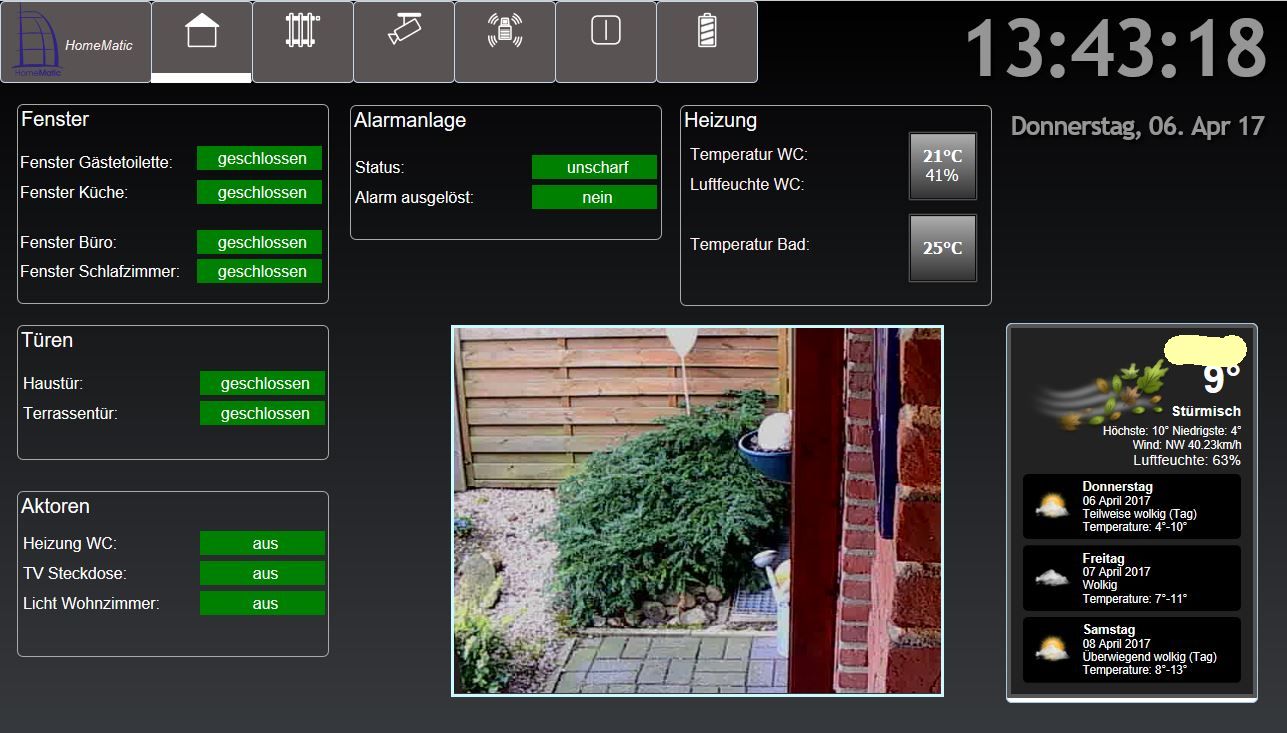 Ein erstes GUI ist fast fertig und läuft zufriedenstellend auf einem Motorola Tablet. Das einzige Problem ist, dass ich meine Alarmanlage nicht über das Tablet scharf/unscharf stellen kann. Ich weiß nicht, welches Objekt ich dazu nehmen muß. Auf meiner CCU habe ich eine Variable mit den Werten unscharf/intern scharf/extern scharf erstellt. Wenn ich HM-rega.0 reinschaue, sehe ich viele Einträge, weiß aber nicht, welchen ich nehmen muß. Bis jetzt habe ich aber außer mehreren Fehlalarmen nicht den gewünschten Erfolg gehabt. Auch der Beitrag von Vore hat mir nicht geholfen.