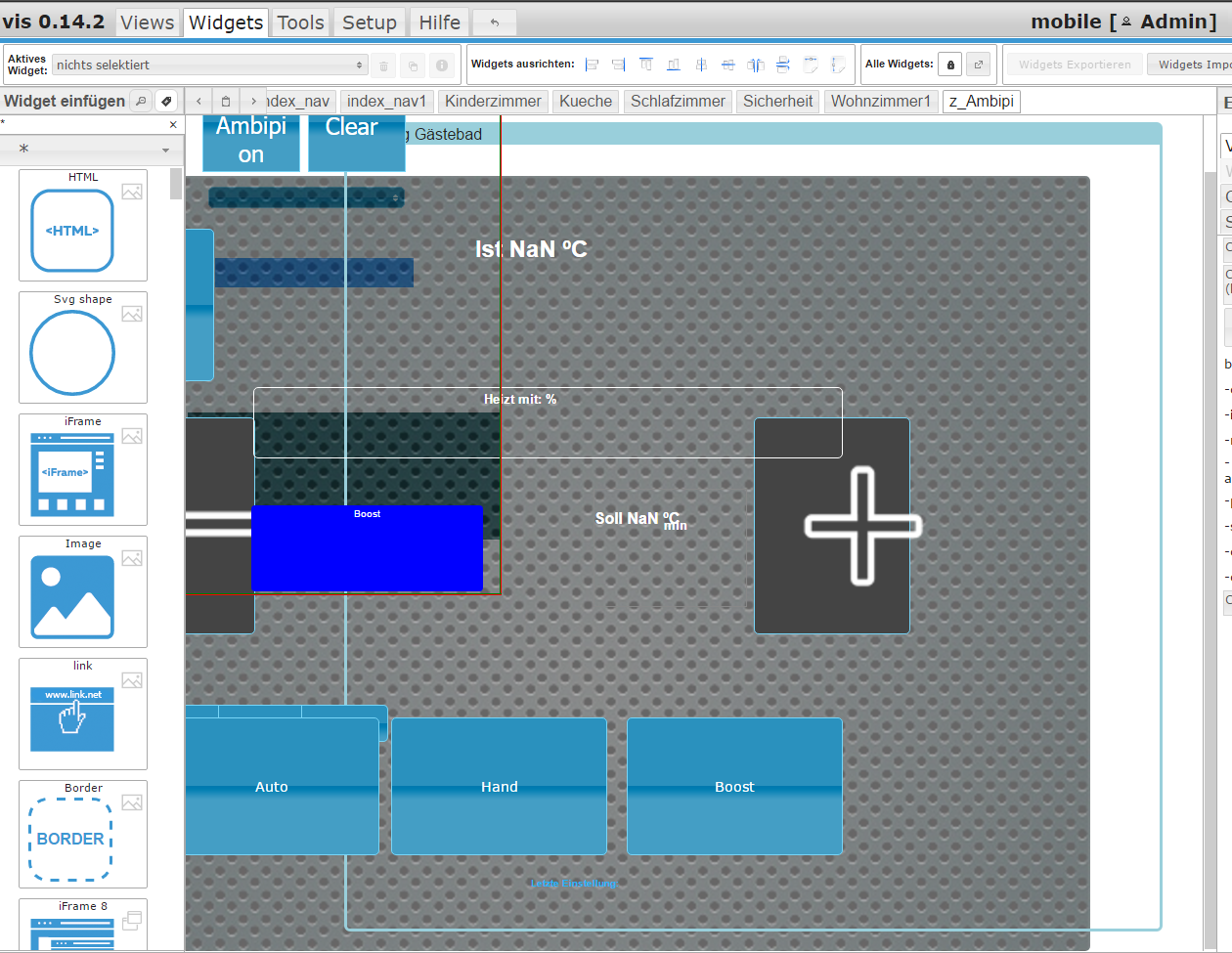 ich packe das mal hier mit rein, da es auch wieder mit grouping zu tun hat, wollte gerade eins von den Heizungsthermostaten von weiter oben in ein anderes Projekt exprotieren, ergebnis ist nahezu identisch zu der Darstellung in der Vis app weiter oben keine relevante fehlermeldung in der console außer can not bind data of widget