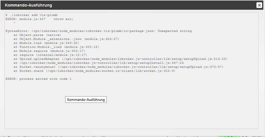iobroker 2017-05-26 20:01:08.590 info exit 1 iobroker 2017-05-26 20:01:08.582 error at Socket.onack (/opt/iobroker/node_modules/socket.io-client/lib/socket.js:312:9) iobroker 2017-05-26 20:01:08.582 error at Socket. (/opt/iobroker/node_modules/iobroker.js-controller/lib/setup/setupUpload.js:373:57) iobroker 2017-05-26 20:01:08.582 error at /opt/iobroker/node_modules/iobroker.js-controller/lib/setup/setupInstall.js:587:24 iobroker 2017-05-26 20:01:08.582 error at Upload.uploadAdapter (/opt/iobroker/node_modules/iobroker.js-controller/lib/setup/setupUpload.js:214:23) iobroker 2017-05-26 20:01:08.582 error at require (internal/module.js:12:17) iobroker 2017-05-26 20:01:08.582 error at Module.require (module.js:353:17) iobroker 2017-05-26 20:01:08.582 error at Function.Module._load (module.js:300:12) iobroker 2017-05-26 20:01:08.582 error at Module.load (module.js:343:32) iobroker 2017-05-26 20:01:08.582 error at Object.Module._extensions..json (module.js:424:27) iobroker 2017-05-26 20:01:08.582 error at Object.parse (native) iobroker 2017-05-26 20:01:08.582 error SyntaxError: /opt/iobroker/node_modules/iobroker.vis-plumb/io-package.json: Unexpected string iobroker 2017-05-26 20:01:08.582 error ^ iobroker 2017-05-26 20:01:08.582 error module.js:427 throw err; iobroker 2017-05-26 20:01:08.027 info add vis-plumb