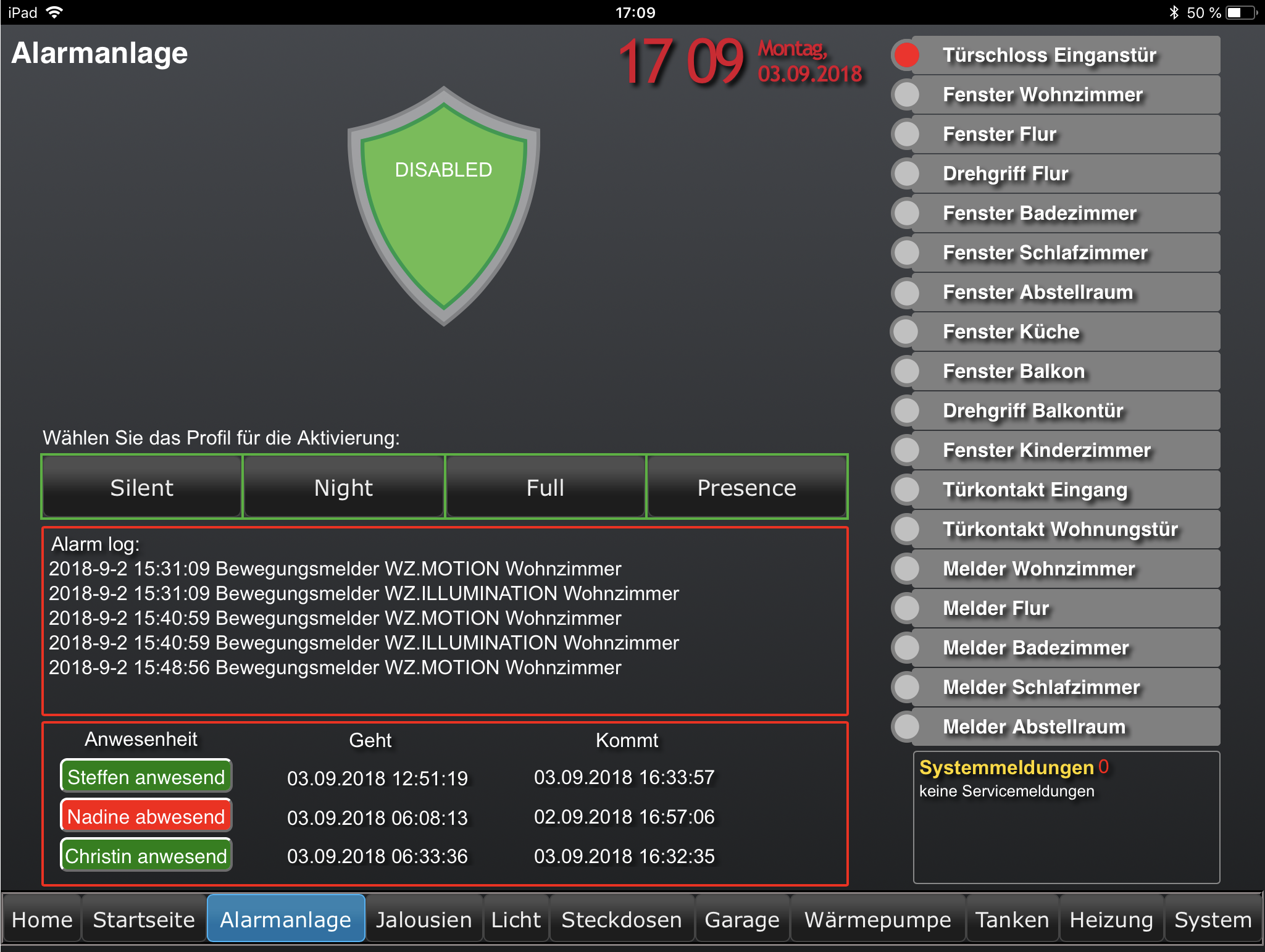 Die Alarmanlage ist auf deinen Screenshot disabled. Ist das Absicht?