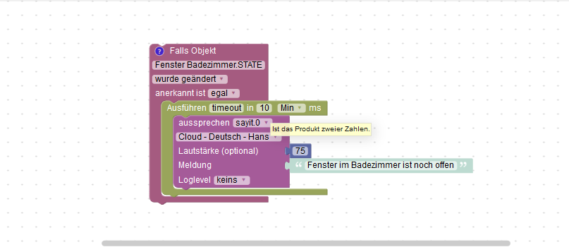 Hab ein Scrit hier aus dem Forum laufen, das die offenen Fenster überwacht. Funktioniert auch toll. Nun hab ich mir ein Blockly gebastelt, das mich nach 10min über den Goggle Home Mini warnt. Funktioniert grundsätzlich auch, aber nicht schön. Wenn ich jetzt zum Beispiel in der Küche ein Fenster öffne und nach 2min wieder schliesse, dann läuft mein Timer. Öffnet man nun paar Minuten später das Fenster im Bad, bekommt man eine Meldung, obwohl das Fenster noch keine 10m auf ist (weil der Timer von der Küche angestoßen wurde)