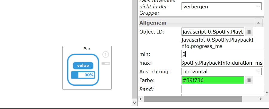 Leider funktioniert es nicht wenn ich in das max Feld javascript.0.Spotify.PlaybackInfo.duration_ms schreibe. Als test habe ich einfach mal als max wert 300000 eingetragen, in diesem fall funktioniert es und ich sehe, dass sich die Progress bar füllt(obere Bar aus dem screenshot, die untere ist die, wo ich den max Wert auf duration_ms gesetzt habe, diese wird immer als komplett gefüllt angezeigt). Hat jemand eine Idee, wie ich den max Wert der Progress Bar auf die variable duration_ms setzen kann?